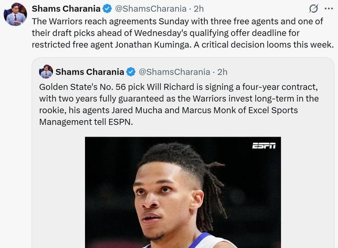 完成三名核心新援的引进后,Shams又接连曝出,勇士队先是用一份4年合同签下56号秀后卫威尔-理查德,合同中包含2年保障部分。