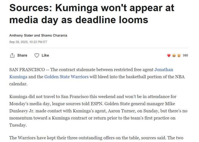 双方目前的争议点在于库明加想要高薪,又不希望合同中存在球队选项,如果底薪则希望加入球员选项,勇士无法满足前者,也不希望在合同中加球员选项。