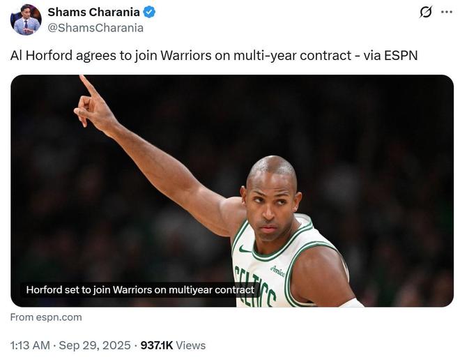 首先是根据ESPN名记Shams报道,霍福德已经与勇士签下了一份多年合同,新赛季他将以勇士首发中锋身份开启其NBA第19个赛季。