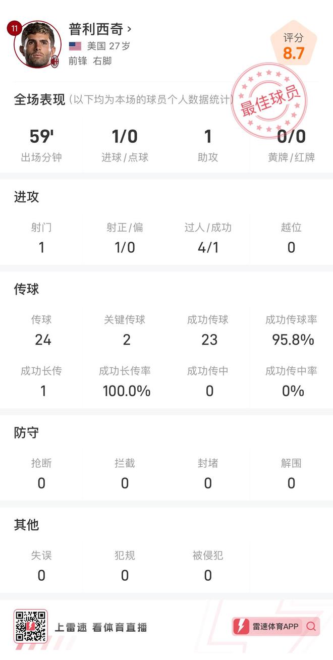 普利西奇vs那不勒斯全场数据:1传1射,传球成功率高达95.8%
